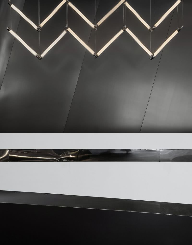 當(dāng)筆直的線條,延伸至圓潤的弧度轉(zhuǎn)角,空間結(jié)構(gòu)上便形成了弧面的幾何視覺。設(shè)計(jì)師通過對(duì)線條的藝術(shù)化演繹,與嚴(yán)謹(jǐn)、干練的商務(wù)氣質(zhì)相結(jié)合,不僅延展出極簡的藝術(shù)細(xì)節(jié),亦描摹出空間予人的第一印象 —— 自由而有序,通透而大方。12根線型燈飾排成陣列,在不同視角下,交織出不同形狀的幾何光影,與創(chuàng)意拼合的接待臺(tái)構(gòu)就豐富的層次感。