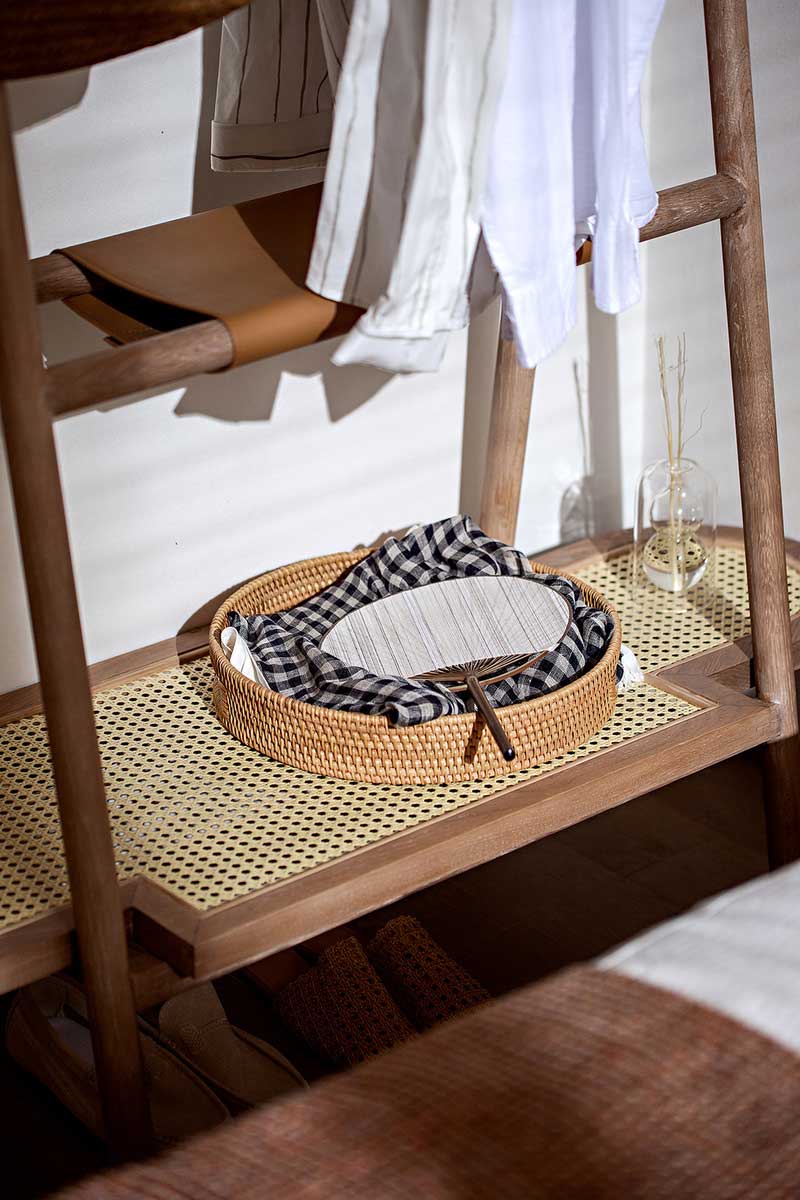 深圳南山區(qū)別墅裝修設(shè)計(jì)-主臥室主臥空間,從休憩區(qū)到衣帽間,到干濕衛(wèi)浴,起居動線便捷流暢。溫潤的原木家具+棉麻材質(zhì)床品,搭配特色民族飾品,營造出溫馨輕松的環(huán)境氛圍。