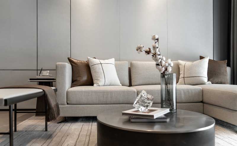 沙發背景墻整墻硬包的設計,打開了空間的開闊些,灰色的憂郁,胡桃木地板的復古,在筒燈的照射下,看上去簡約而不簡單,素雅不施粉黛的格調中,盡顯中式的情懷的憂郁氣質。