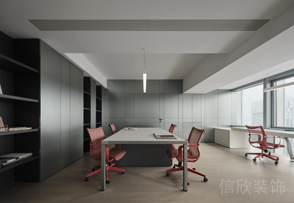 黑色半墻金屬過道設計木質長桌辦公室會議室設計