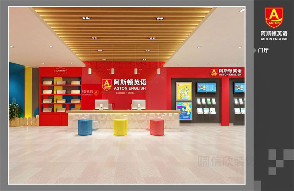 木藝格柵頂給人的感覺,有家的溫馨,錯拼的地面,增加立體感,大紅色純色背景墻的應用符合學校的主題,也多一分大氣醒目的品牌效應。