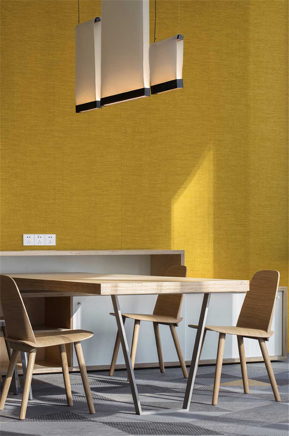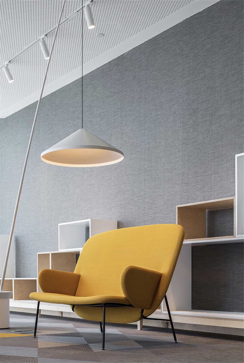 邁科集團現代風格辦公室洽談區,純白色的洽談區,白色的木質沙發,原木風的桌子,北歐風的藝術吊燈。