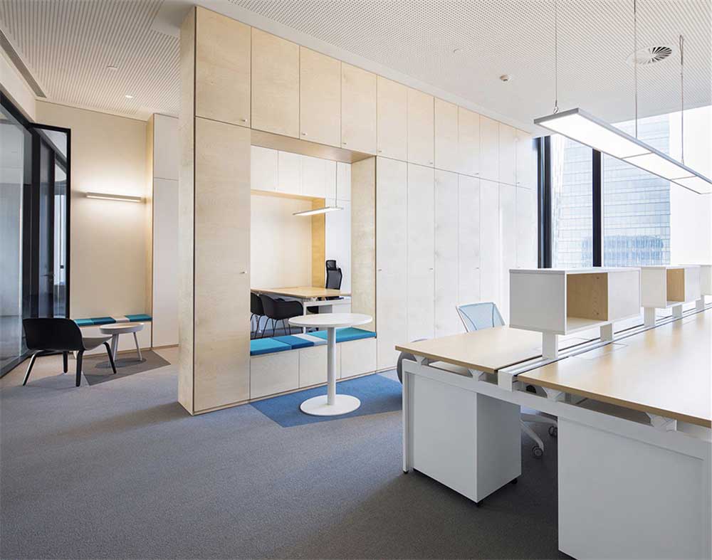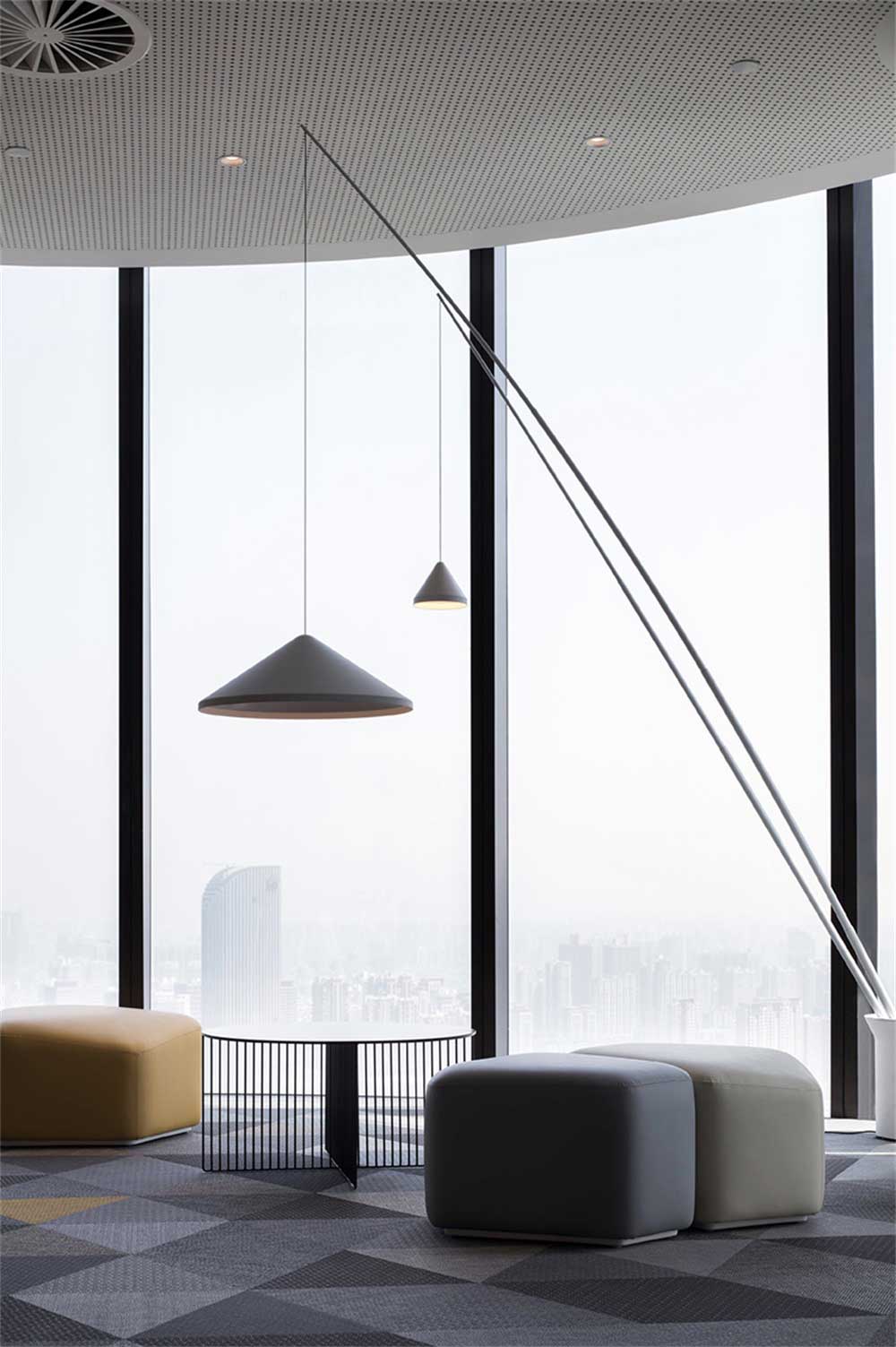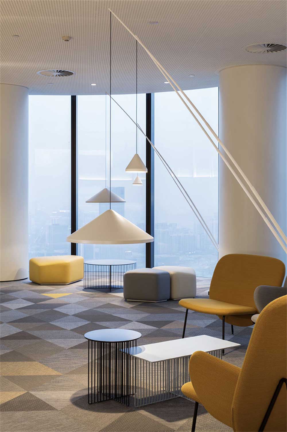 邁科集團現代風格辦公室休息區,通過抬高地臺隔出的小區域既滿足區域性的劃分,又感覺很有趣味。