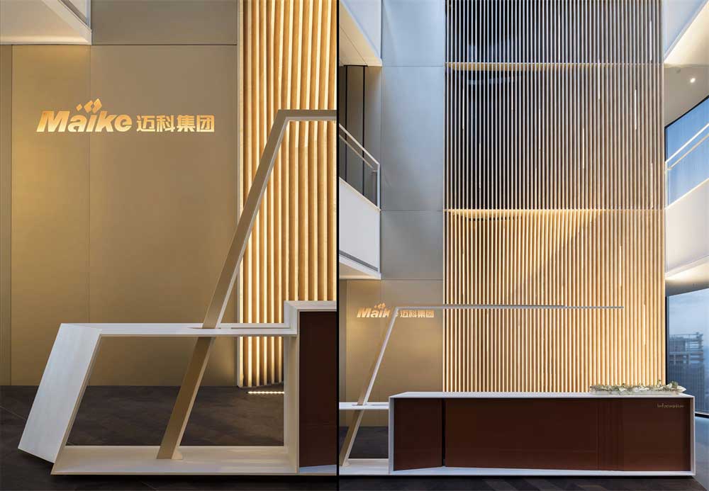 邁科集團現代風格辦公室前臺,實木格柵背景墻,造型獨特的藝術效果前臺,前衛而獨特。