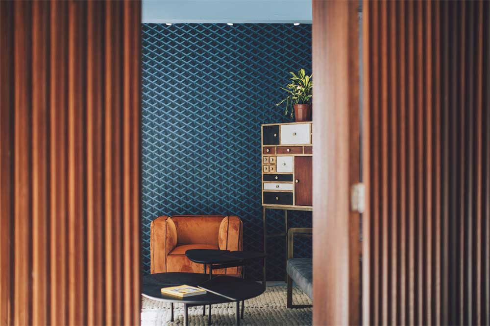 深圳市龍崗區(qū)輕奢風(fēng)辦公室裝修前臺,藍(lán)色格柵木藝的前臺,白色大理石的臺面,看上去很有古舊的歲月感。