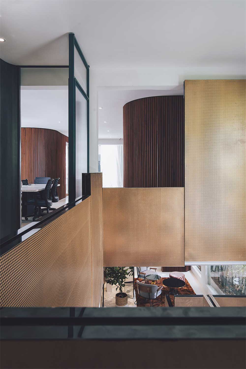 深圳市龍崗區(qū)輕奢風(fēng)辦公室裝修大廳,彩色磨砂玻璃的隔斷,香檳金的樓梯,復(fù)古而典雅的韻味。