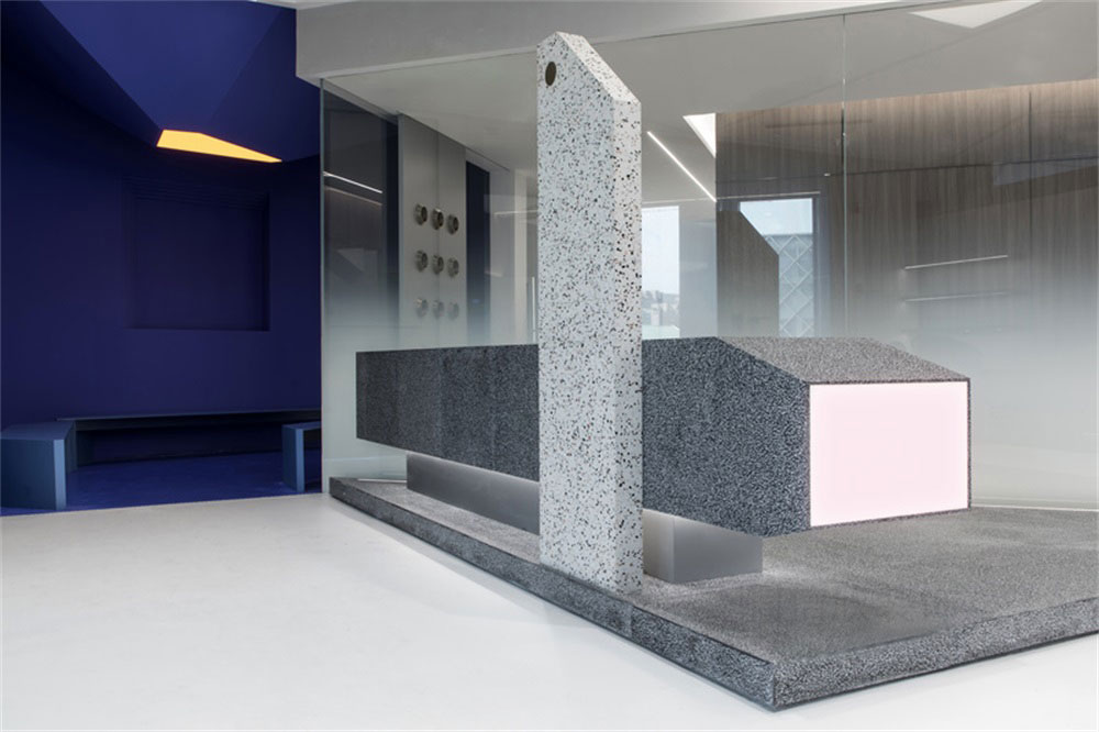前臺(tái)的設(shè)計(jì)上,采用了立體圖形拼接的方式,設(shè)計(jì)新奇獨(dú)特,創(chuàng)意十足,黑白灰藍(lán)四種顏色為基調(diào),把多個(gè)立體造型,組合為一個(gè)藝術(shù)感十足立體圖形。