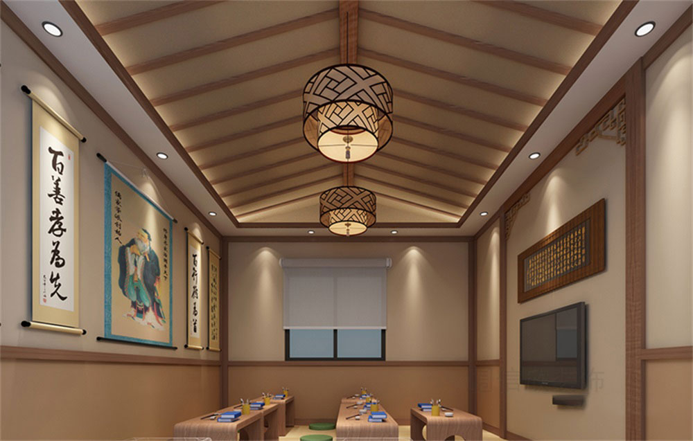 書法教室的裝修設計,杏色為主題的墻面,木藝雕花隔斷,三角形的頂面,是整個空間仿佛穿越千年的歷史長河,盡顯中華古典文化的雅致和詩情畫意。