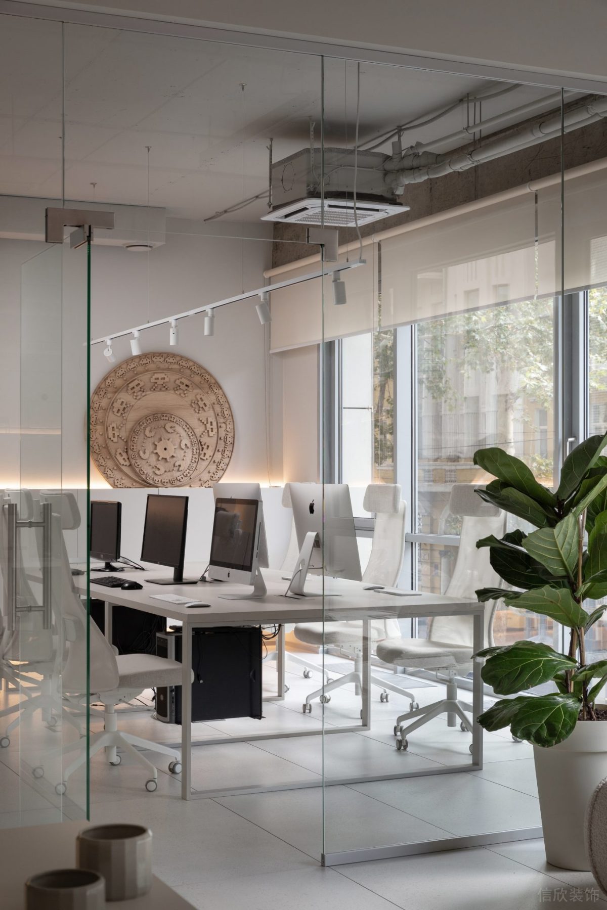 選擇白色或淺灰色等純色調(diào)的油漆涂料來涂刷天花板,這樣的設(shè)計(jì)簡(jiǎn)潔明快,能夠?yàn)檗k公室提供明亮的空間感。此外,純色的天花板也有利于突出其他裝飾元素的特色。選擇鮮艷的藍(lán)色通風(fēng)管作為裝飾元素,將其暴露在天花板下方,突出工業(yè)風(fēng)格的特色。藍(lán)色通風(fēng)管與純色天花板形成鮮明對(duì)比,增加了空間的活力和趣味性。