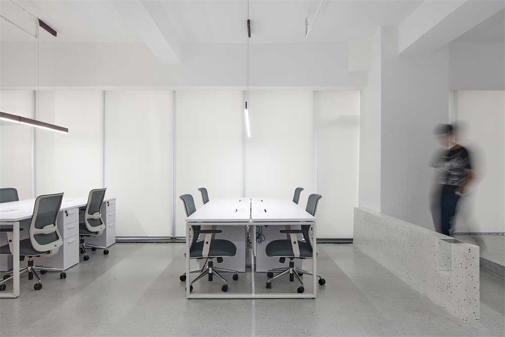 辦公區的裝修設計,采用開放式的場景,純白色的環境,促進了同事間的交流和溝通。