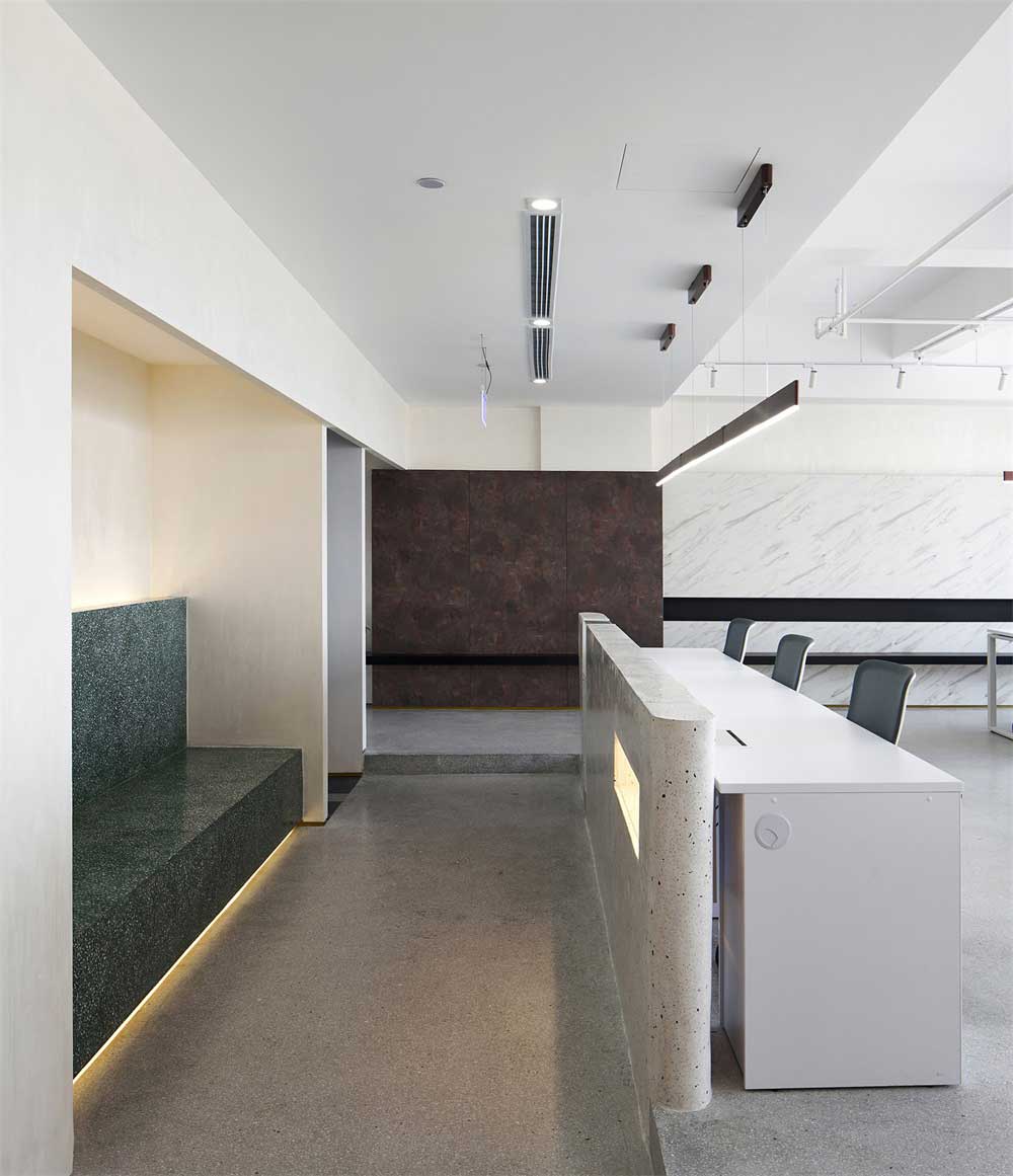 設計理念:本案是一所現代風格的辦公室裝修設計案例,以簡單的陳列代替復雜的設計來體現空間的質感,通過不同材料的組合,和合理的空間劃分,讓辦公室看起來充斥著現代的潮流感和時尚的設計,同時在細節方面做的非常到位,以精美的軟裝設計理念,使得整體的檔次得到一個質的飛躍。辦公室入戶的區域,以幾扇現代藝術的玻璃門和光影的無規律組合,起到了隔斷入戶和門廳的區域分隔效果,但是看起來藝術性十足。過道的設計,用灰色水泥,和亞克力玻璃材料的結合,給人一種流光溢彩的拱形門的既視感。廳面設有白色天然石材紋理的背景墻,和小碎花顆粒的吧臺,把石材的天然肌理展示出來,讓吧臺成了辦公室一道美妙的風景線。辦公區則以白色作為主題色彩,盡可能的保留了原始工業感的結構,僅僅做了刷白和刻意裸露的管道和軌道吊燈,讓辦公區顯得光線飽和度極高,充足的光照效果,使的面積更開闊,工作起來氣氛更輕松和舒暢。