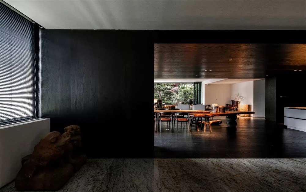 設(shè)計理念:本案是一所新中式風的辦公室裝修設(shè)計案例,由信欣裝飾公司設(shè)計團隊親自操刀設(shè)計,征得業(yè)主的同意,在滿足功能性需求的同時,以新中式的理念入手,讓唐詩的美感融入到設(shè)計,以情入鏡,以景入畫,創(chuàng)造出一副符合中國古典美學的現(xiàn)實中的山水畫作。功能性區(qū)域包括,辦公區(qū),洽談區(qū),吧臺區(qū),弱化了傳統(tǒng)的分區(qū),以全景的設(shè)計方式,來體現(xiàn)既滿足辦公室的實用性,又能放飛自我,不受空間的束縛。大廳黑色的原木風,長條形天然實木辦公桌,微弱的光影變化等效果,呈現(xiàn)出一副古色古香的畫卷。洽談區(qū)則以室內(nèi)景觀,和大開門式的窗戶把室外的景色結(jié)合到了室內(nèi),用灰色大理石地磚略做空間的區(qū)分,實木的中式家具的精巧擺放,塑造出厚重感和品質(zhì)感的完美設(shè)計。