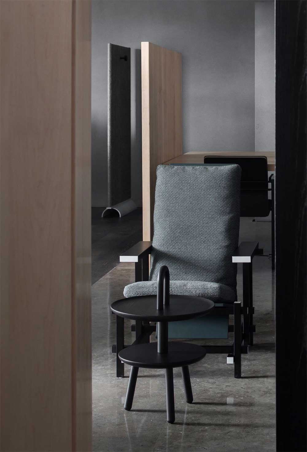 原木風辦公室裝修設計灰色,灰色水泥澆筑和黑色長條形木板結合的會議室,原始粗獷,自然的設計理念。