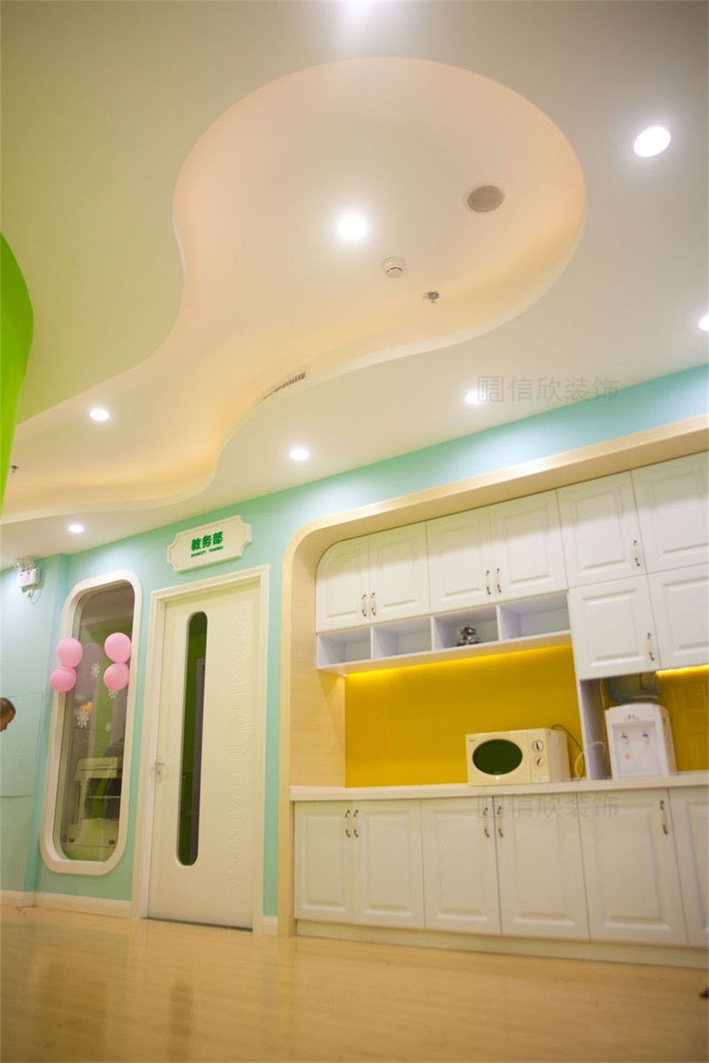 原木色和綠色,用弧線分割的背景墻,看上去猶如清晨破土而出的小草,生機勃勃,有著生命的頑強活力。