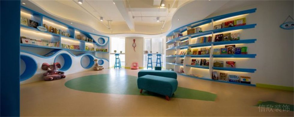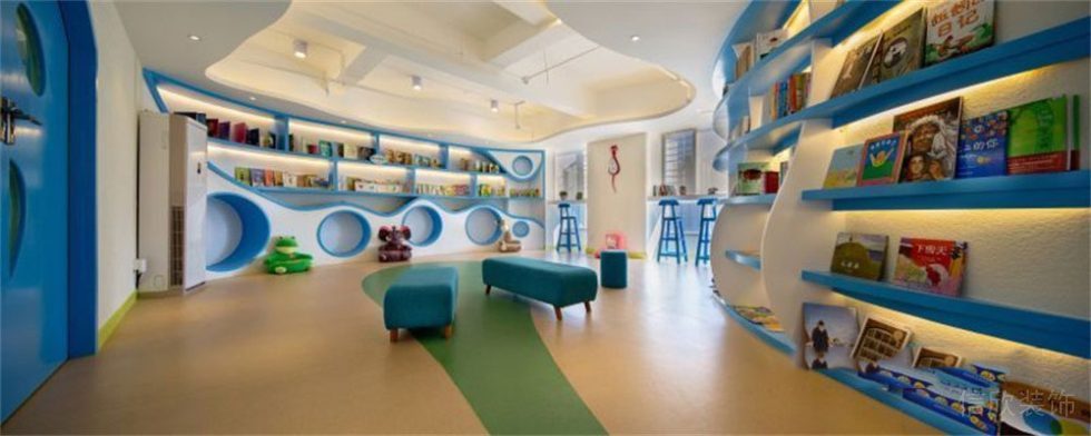 嵌入式的書(shū)柜,采用藍(lán)色和白色的不規(guī)則曲線,構(gòu)成和頂面相呼應(yīng)的立體圖案,既卡通新穎,又有著無(wú)限可能的想象力。