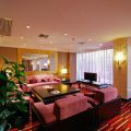 就餐區整齊的擺放的高級灰椅子和橘色的沙發,加上做舊復古的墻磚,給人增加了一種食欲感。