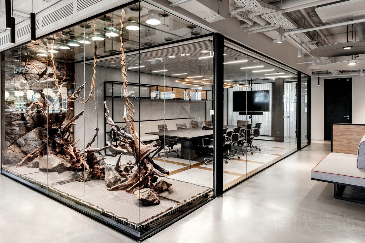 選擇原木設計墻面可以為辦公室帶來自然、溫暖的感覺。可以考慮使用原木板材或者仿木紋涂料進行墻面裝飾,營造出自然木紋的質感和紋理,為辦公室增添一份質樸和舒適的氛圍。在辦公室設置木板環形落地式玻璃門,不僅可以將空間分隔開來,還能夠保持空間的通透性和流動感。玻璃門的設計可以讓自然光線透過,為辦公室增添一份明亮和開放的氛圍,與原木設計墻面相互呼應。選擇米白色地板可以為辦公室增添一份清新、明亮的氛圍。米白色地板不僅可以提升空間的明亮度,還能夠與原木設計墻面和玻璃門形成對比,突出原木的自然質感和玻璃的透明感,營造出一種現代與自然相融合的裝修效果。