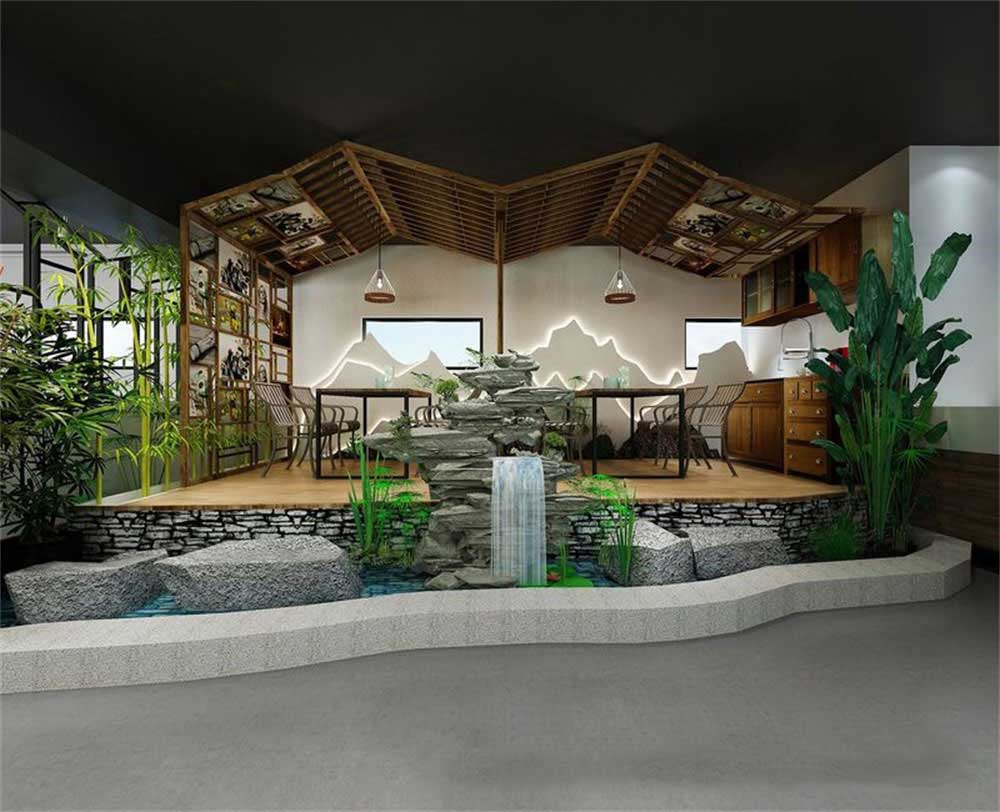 前臺及展示區背景墻采用不規則造型,設計師采用山水意境、現代的材料營造出一幅禪意水墨畫,遠處的遠山虛虛實實,十分具有中式禪韻。