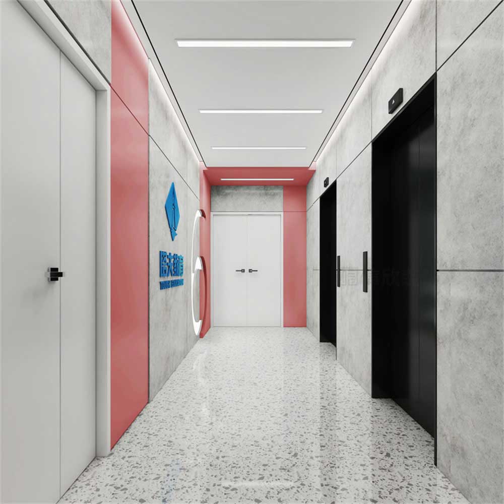 灰色水泥巖板的墻面,和黑色的電梯門,相得益彰,有一種原始,野性的粗獷之美,配上現(xiàn)代元素的帶燈條吊頂,有著自然和諧的美感。