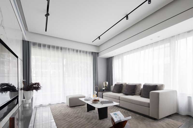 設計理念:本案是一所現代輕奢風的家居裝修設計案例,主要通過素白的空間色感,灰色的墻面和地面,讓家居整體感覺光線飽和度高,光照效果好,把戶外的光線完美的引入到室內,明亮寬敞,簡答開闊,客廳無主燈無頂式的設計,白色的頂面,結合黑色的軌道射燈,時尚簡約,經典百搭。整面墻的大理石紋理的嵌入式電視背景墻把電視隱藏其中,既不會占空間,看上去有美觀,灰色的布藝沙發和波浪形的地毯,紋理感強烈,動線和靜線結合,活躍了整個客廳風元素。
