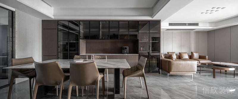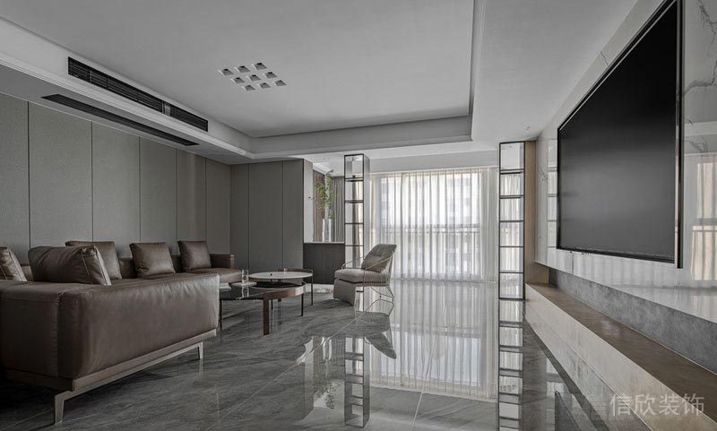 深圳市羅湖區田貝德弘天下華府沙發背景墻 灰咖兩色的單一背景墻,冷色調的飽滿色感,現代皮質沙發,潮流感十足。