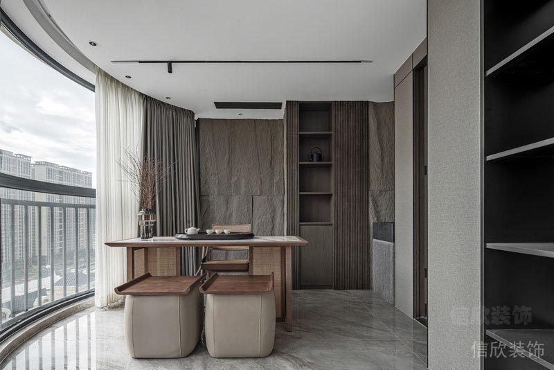 深圳市羅湖區田貝德弘天下華府茶座 清水洞石的背景和茶柜,木藝簡約的茶座;接近自然原始生活方式的休閑方式。