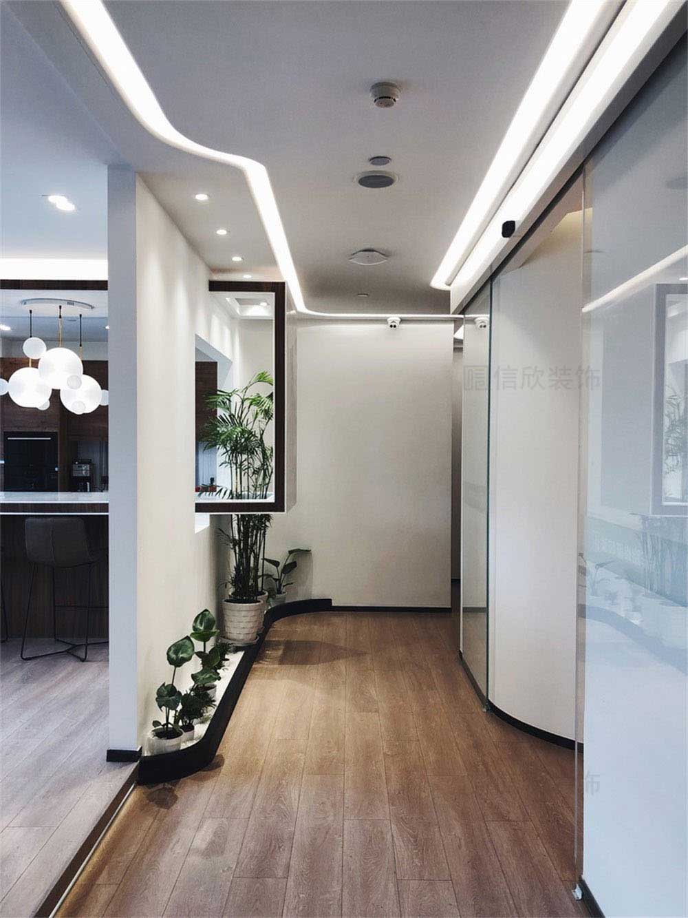 走廊的裝修設計,開闊式的設計,一眼望去可以直接看向盡頭,原木風的地面,搭配直通到底的燈膜設計,曲線靈動,明亮大方。