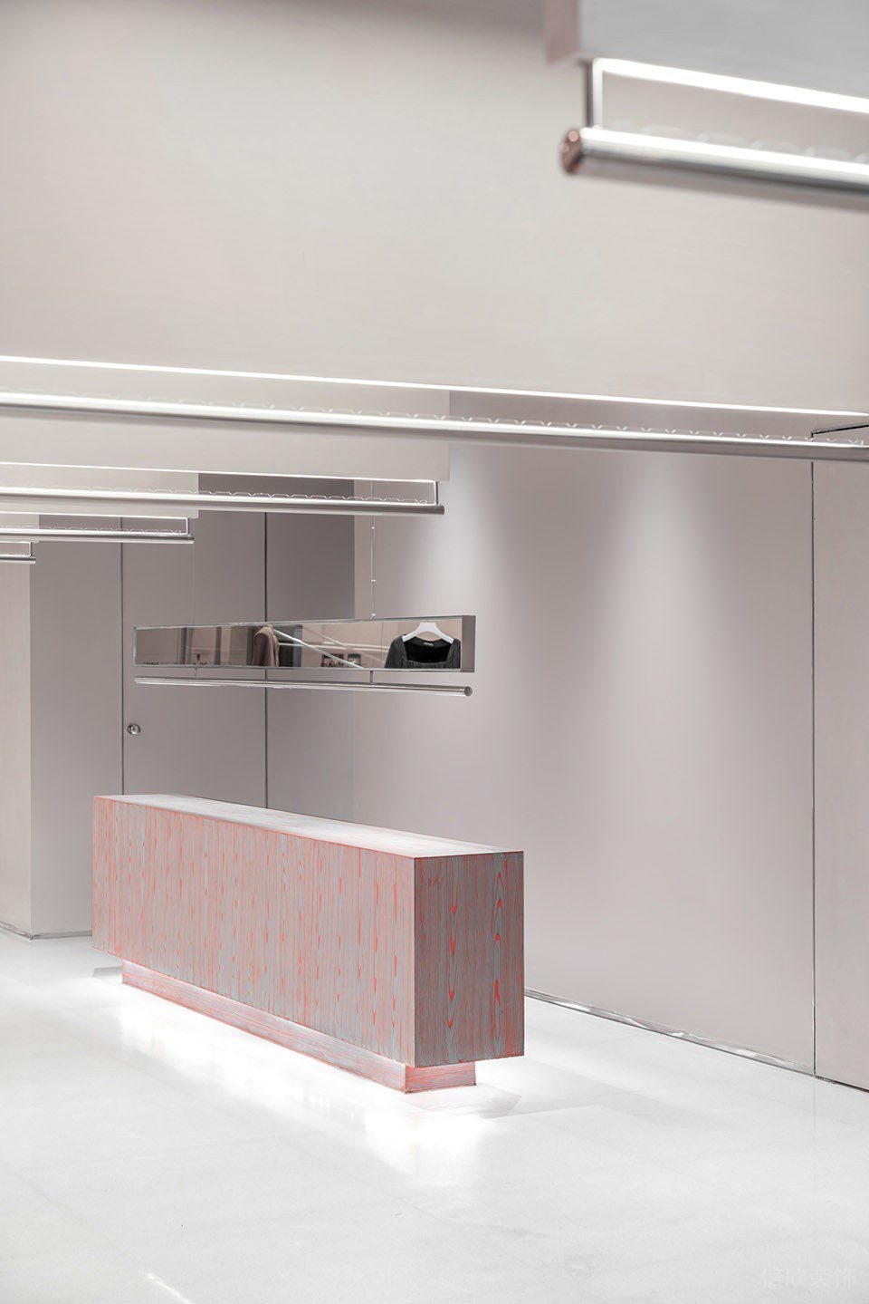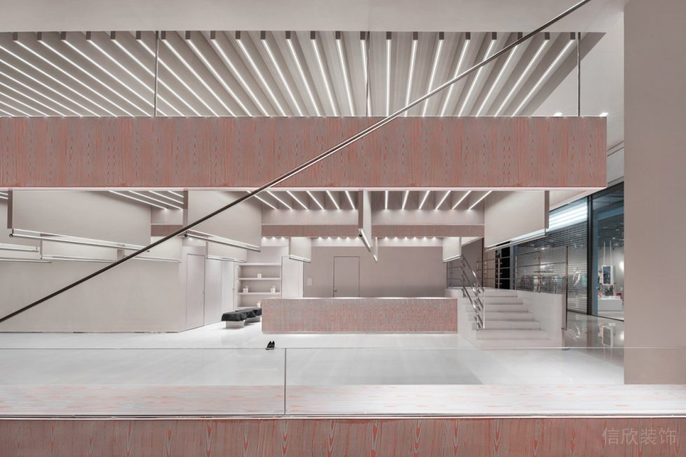 現代風服裝店粉色系概念店裝修大廳,開闊式的大廳,白色的地面,格柵的頂面,溫馨的同時充滿了大品牌的奢華感覺。