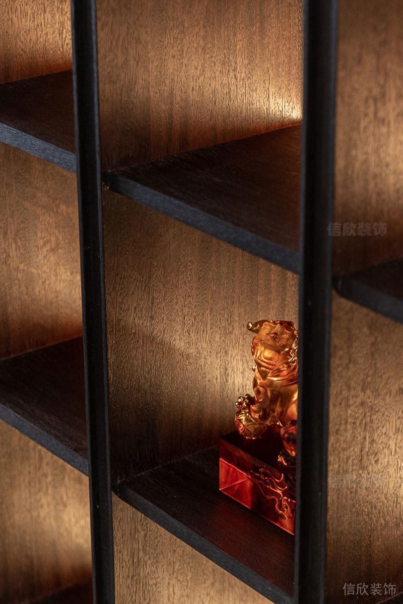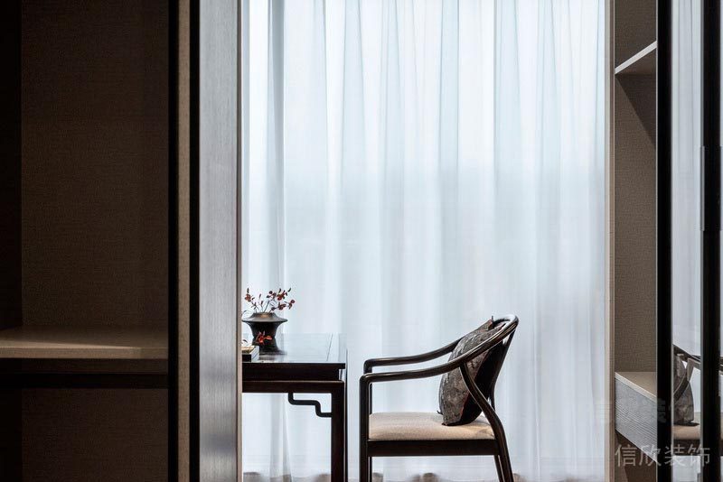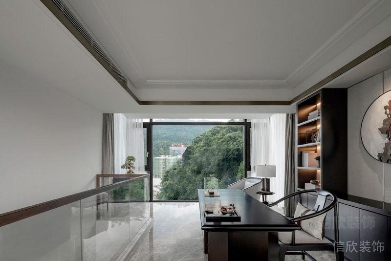 深圳市西鄉書房 書房的設在樓梯轉角的開放式空間上,既通透又明亮,符合中式設計的特點,采用了古色古香的黑胡桃木書桌的和書桌,讓您靜思閱讀的時候;可以可以細細感受中華文化所獨特的書香氣。