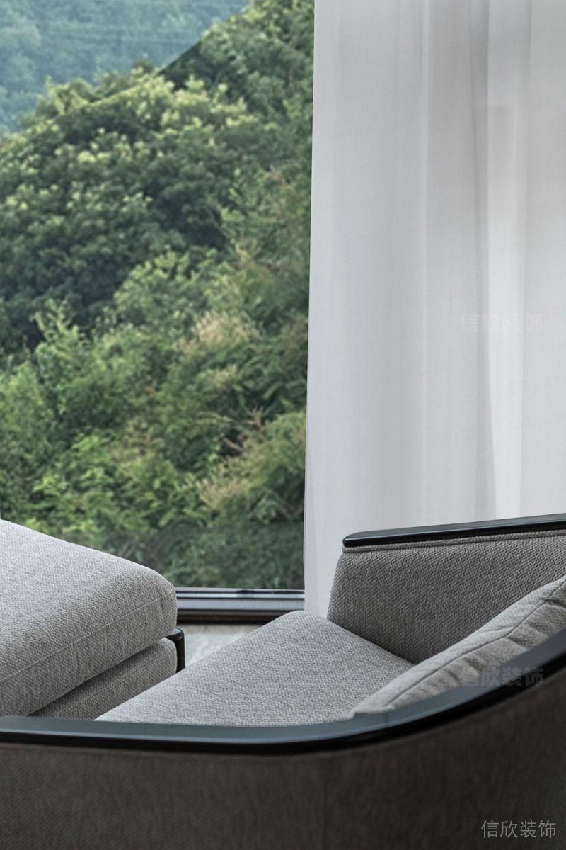 深圳市西鄉客廳 首層是一個既開放又相對獨立的功能空間,客餐廳連為一體,兩端大面積的落地玻璃,實現了室內外空間的最大化接壤,人的視野得以連續與向外延伸。軟裝整體為素雅的暖灰色調,通過經典的中國紅來進行點綴,打破沉悶的氛圍,讓空間更富生機與活力,于簡潔素凈之中,顯露雅致與穩重并存的東方性格。