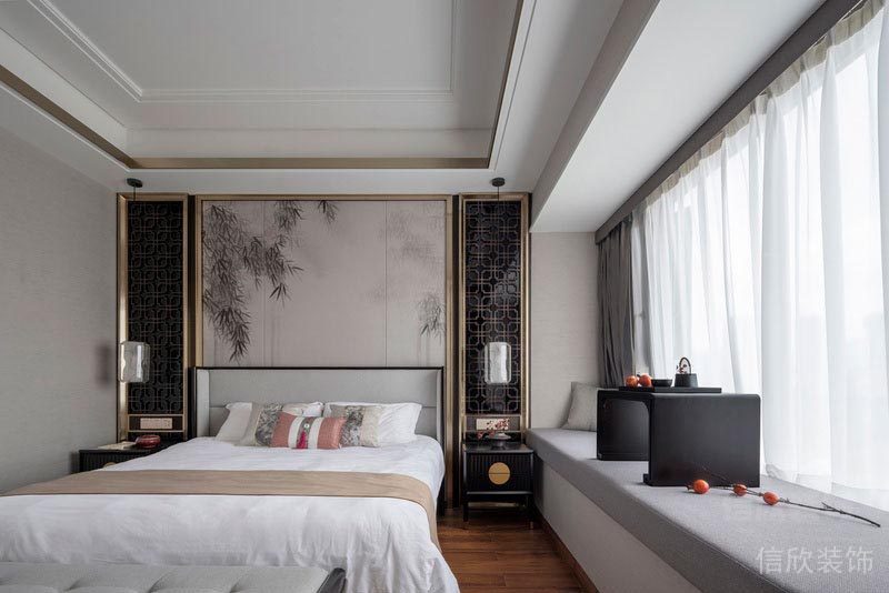 深圳市西鄉主臥背景墻 古典雅致的實木鏤空雕花屏風、富有東方氣韻的淡彩墨竹壁畫背景,以及半透明的玻璃床頭吊燈,相互映襯,盡顯清雅與平和,展現著東方人文精神的傳承與蛻變,以豐富的細節展現出低調卻極富藝術性的生活品位。
