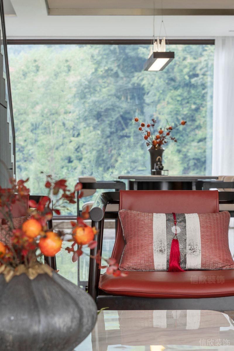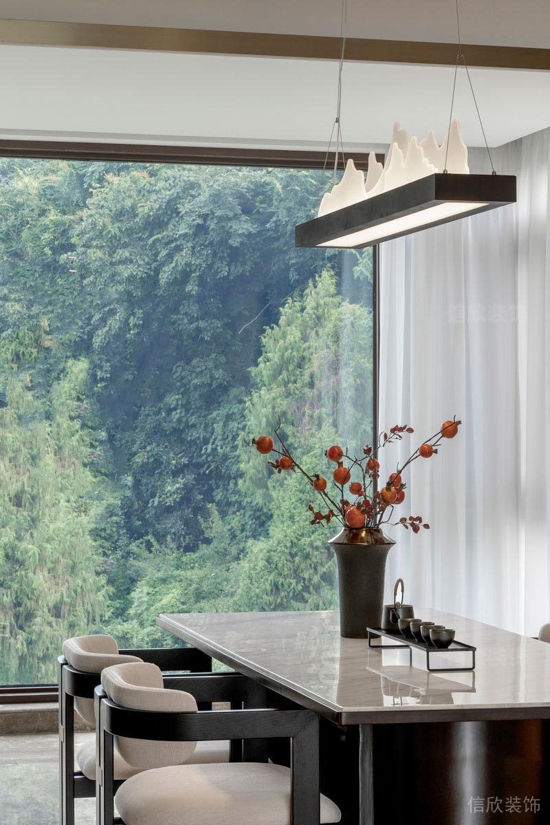 深圳市西鄉客廳 穿過玄關,進入過廳,左邊便是餐廳。實木布藝軟包座椅,極具設計感的扶手造型,碩果累累的鮮紅色石榴花藝,精致典雅的陶藝茶具,散發著濃郁的東方文化情懷。餐桌上方的半透明亞克力山形吊燈,與窗外的青山遙相呼應,在與自然的對話中,感受“久在樊籠里,復得返自然”的那份閑適與自在。