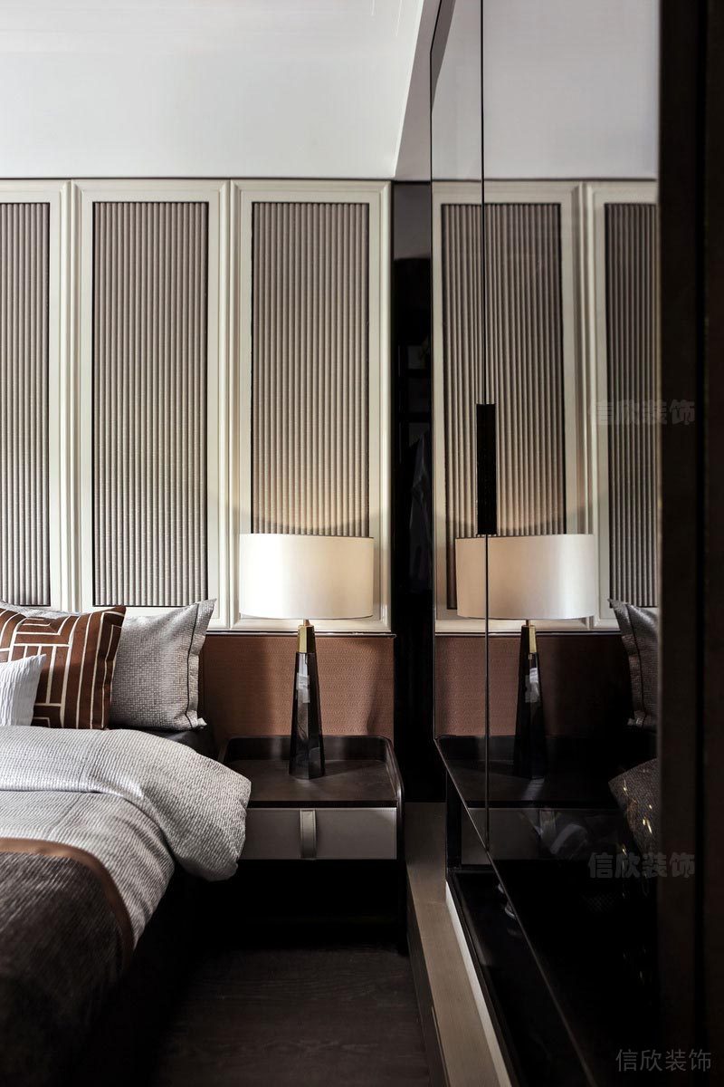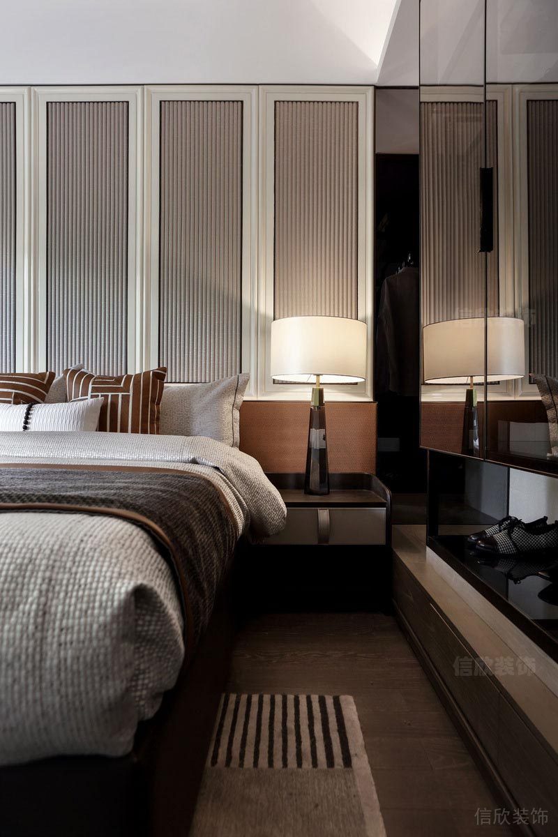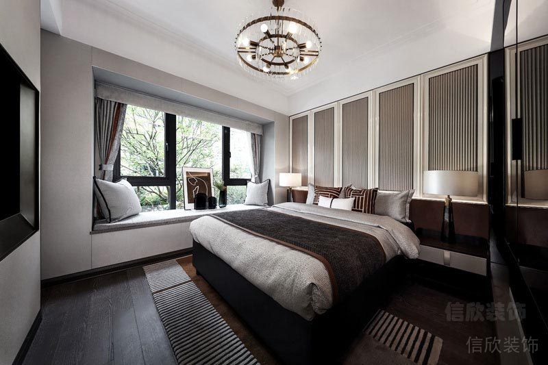 溫馨的布藝床,舒適而實(shí)用,仿古吊燈造型簡潔而沖擊感墻,木藝背景墻簡單而線條優(yōu)美流暢。