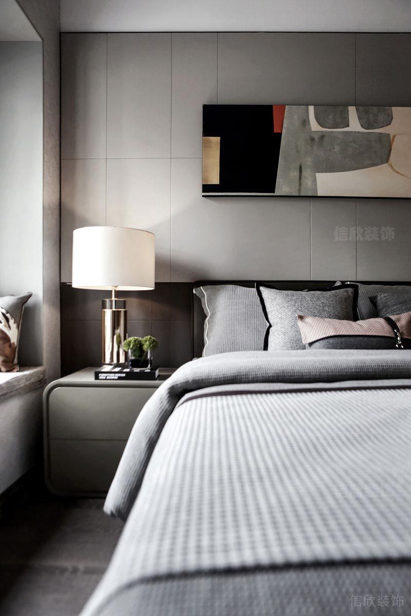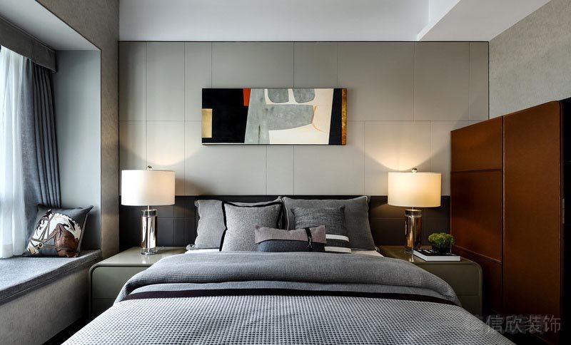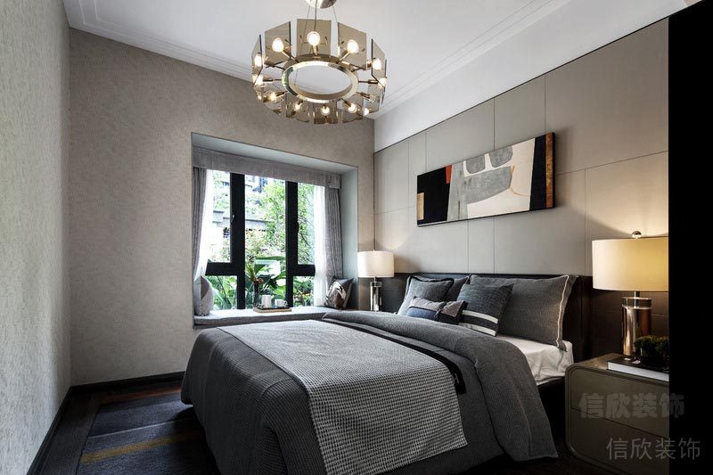 灰色調(diào)為主題的次臥,冷傲而高雅,造型吊燈,中性色的柜子,配合明亮日光充足的環(huán)境;詮釋出精神世界的追求和氣質(zhì)。