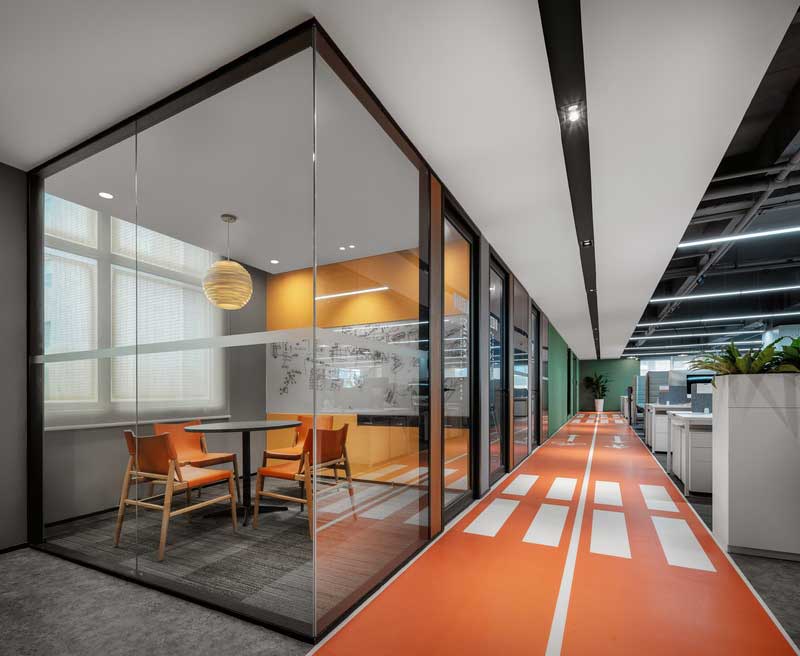 用企業色彩打造一條貫穿整個辦公空間的旅行跑道,沿路風景一覽無余,各部門及各功能區域在跑道兩側延伸,提高空間的工作效率