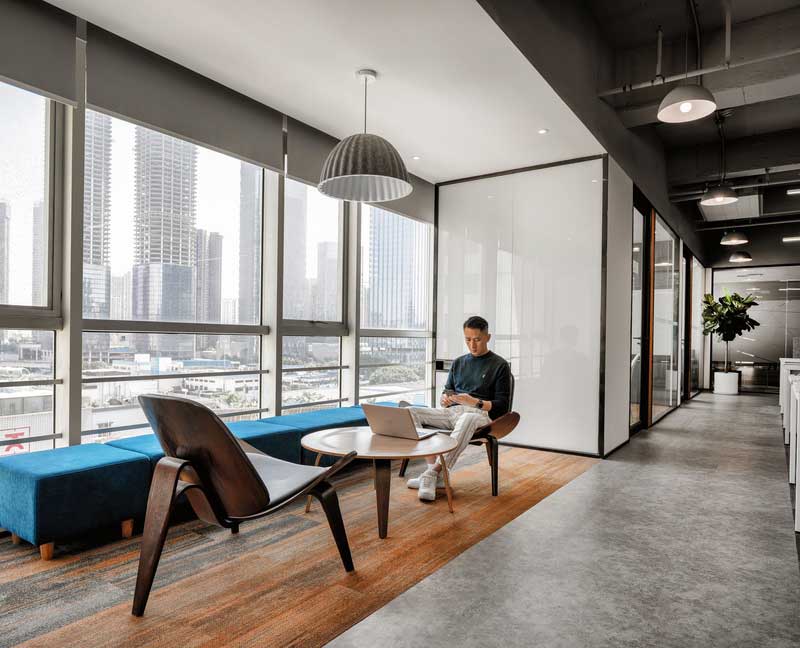 無論在開放的工位或是休閑區,城市景觀一覽無余,以模糊邊界的姿態讓室內空間與自然環境交融,提供了良好的采光及視野,給予了工作生活舒適的視覺體驗。