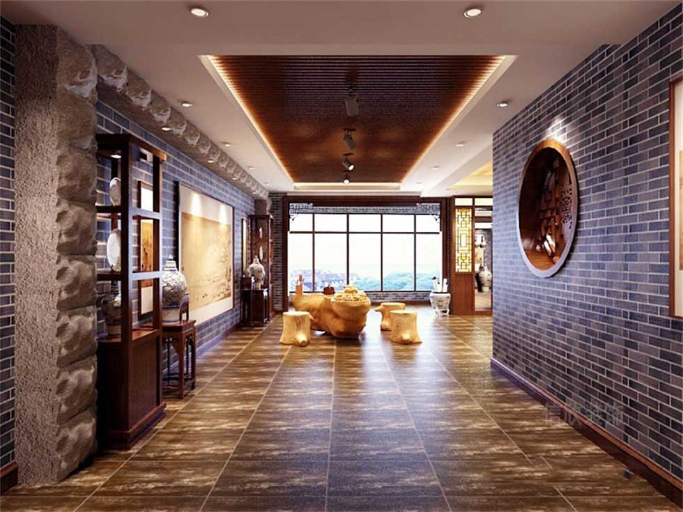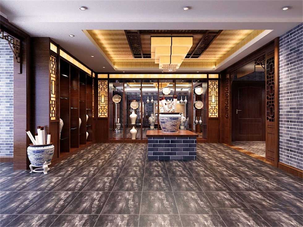 灰色石洗的地面,層次分明,紋理豐富,通過回形頂和格柵頂把空間做了一個局部的分隔,青石磚砌成的展示臺,上面的仿古的青花大罐瓷器,在吊燈的照射下莊重威嚴的氣質。